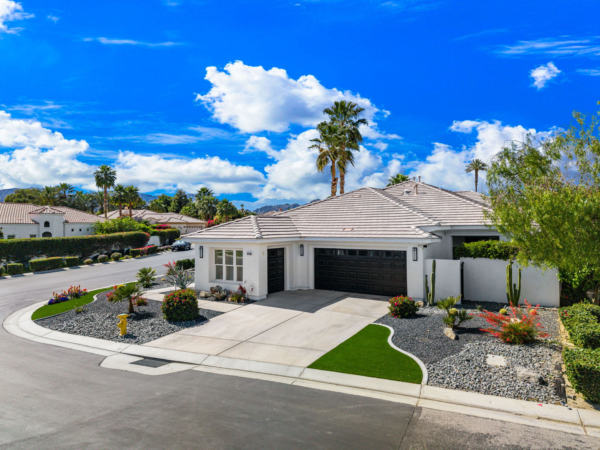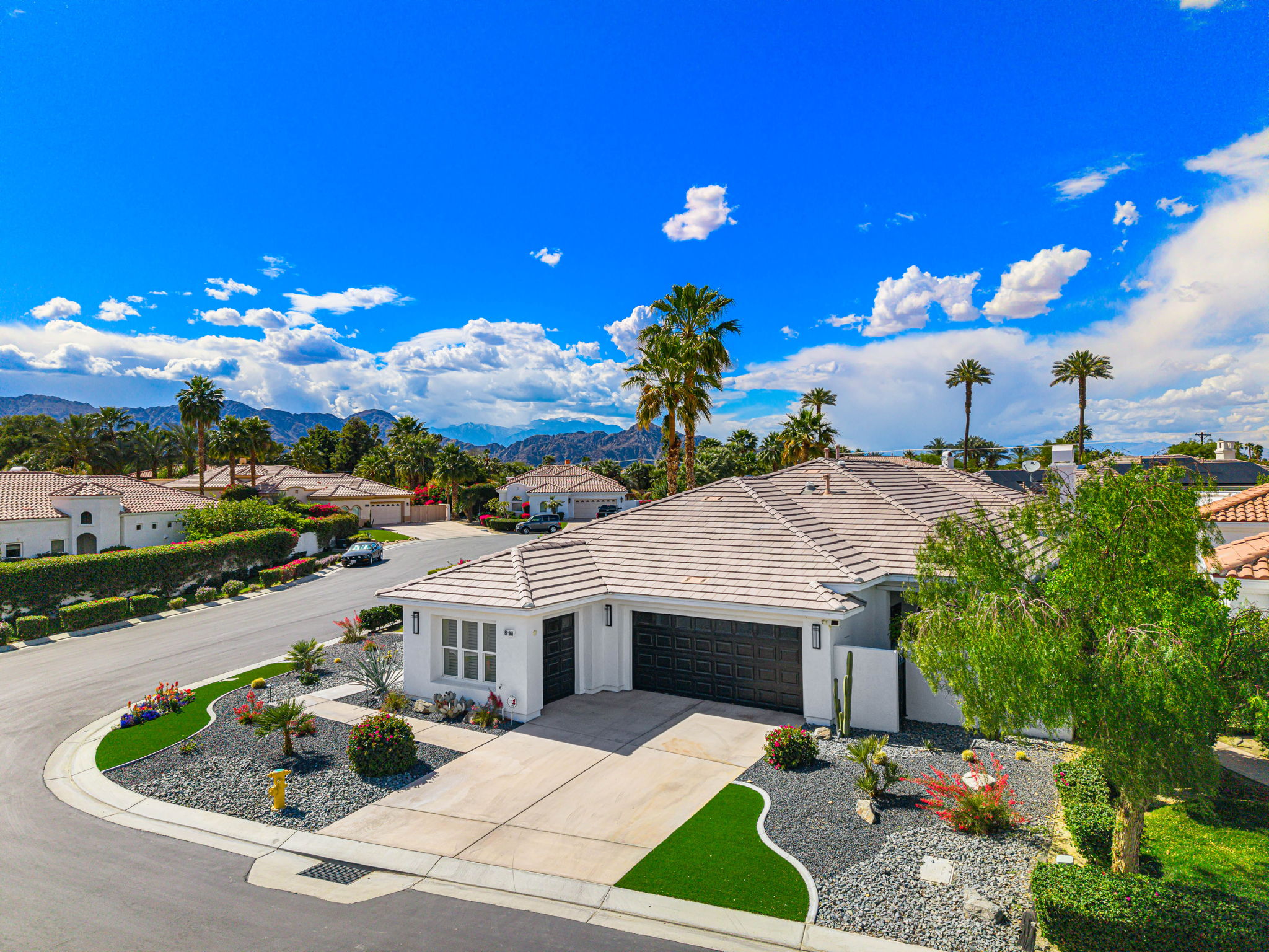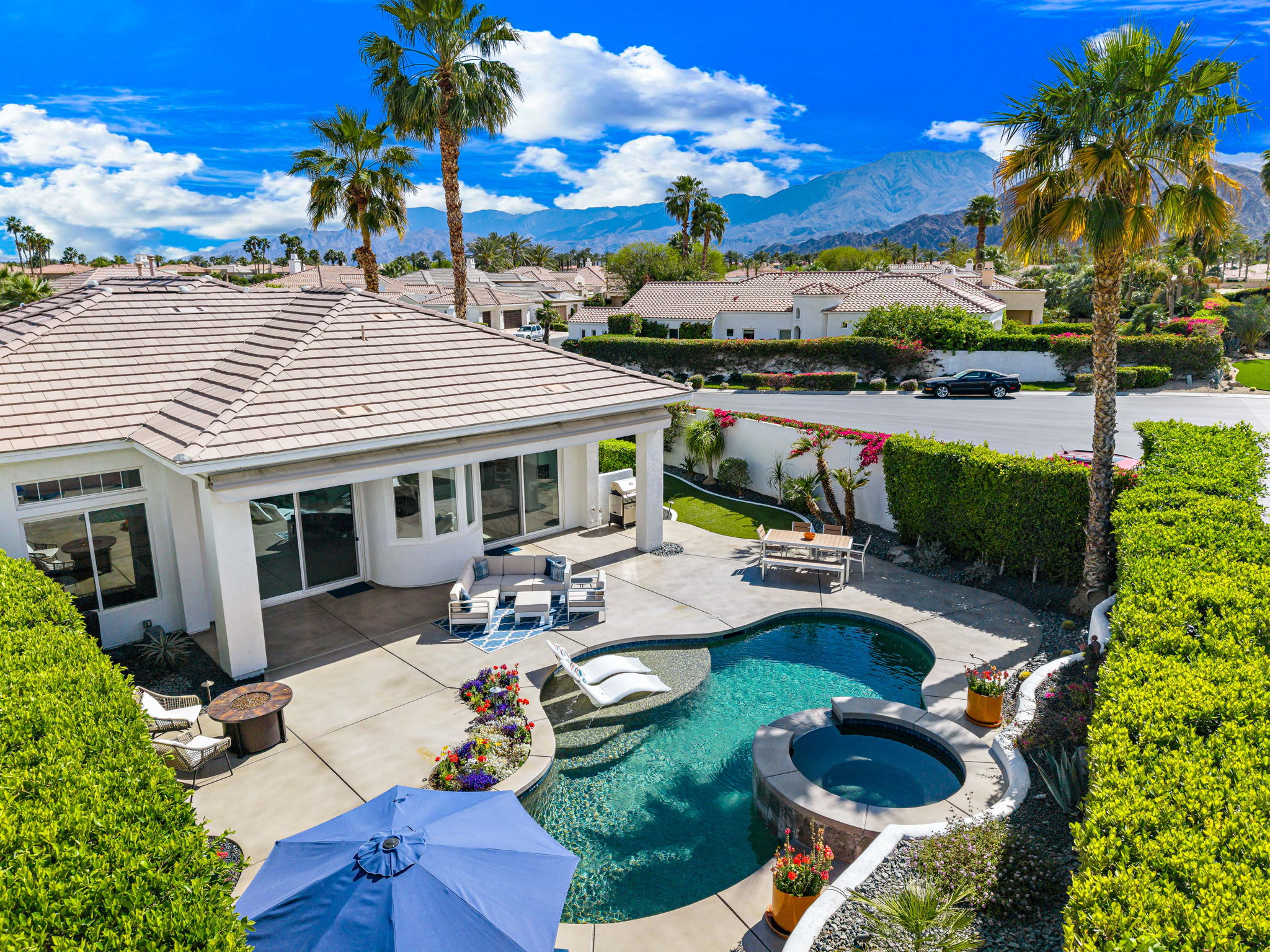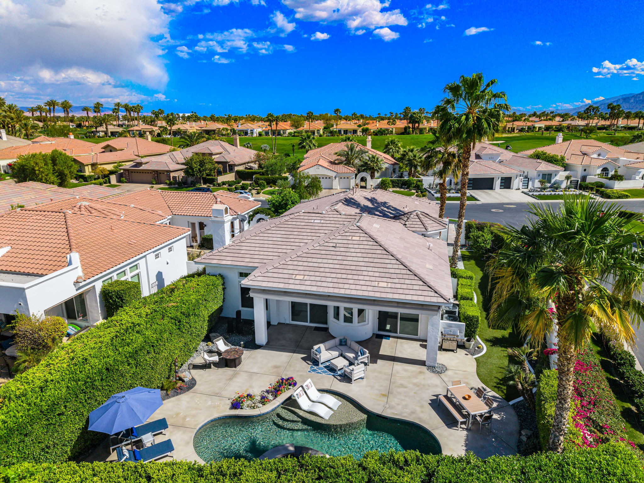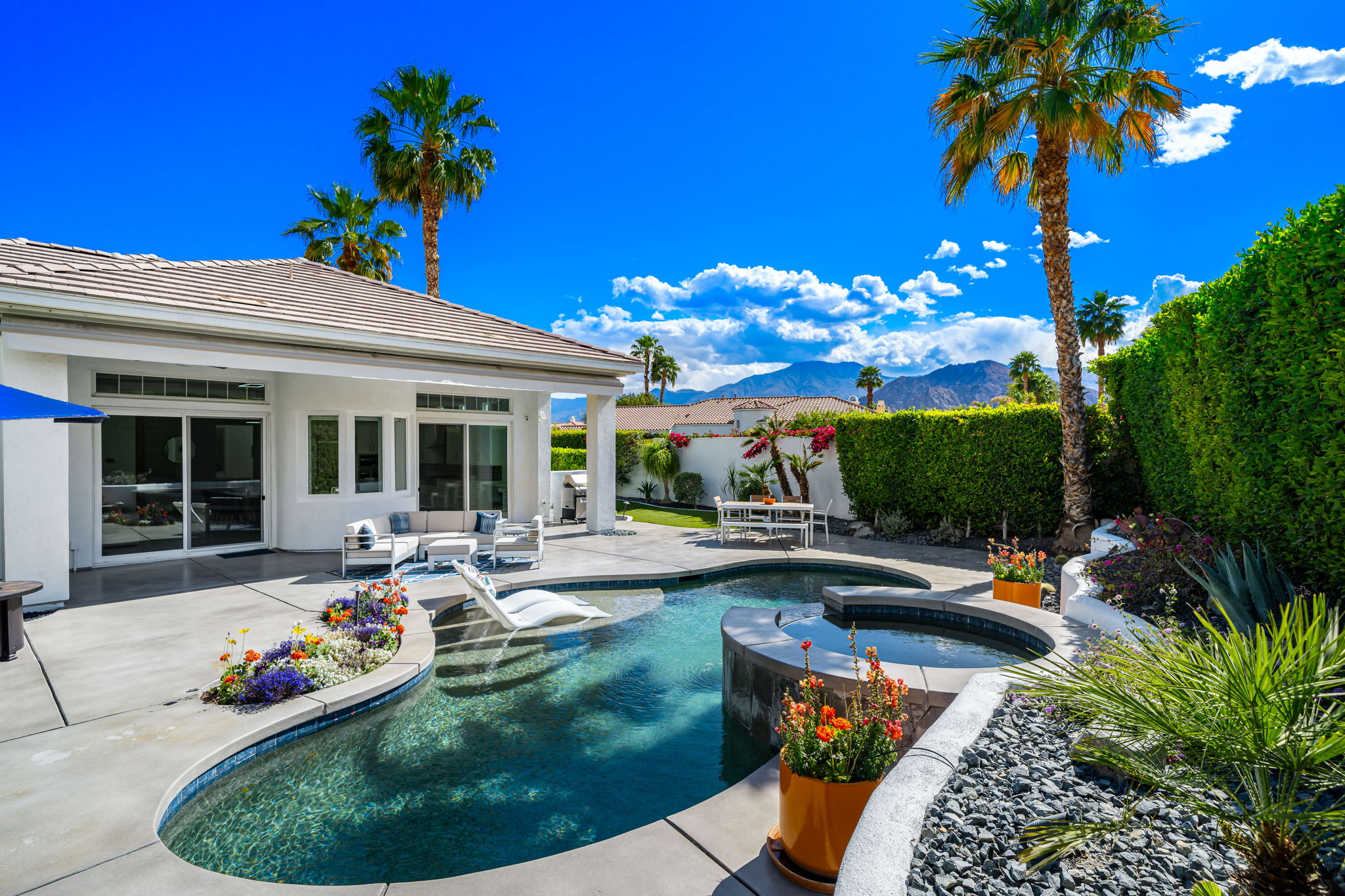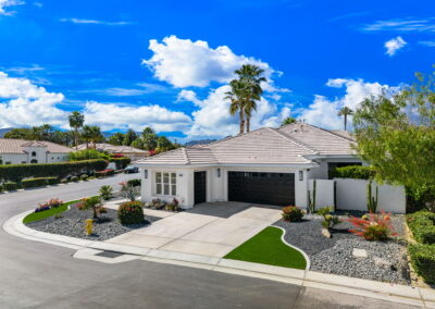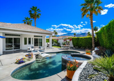 PRICE REDUCED. Private backyard perfect for our 4 legged friends, this house that delivers on all counts! Welcome to 80360 Via Valerosa, an exceptional desert retreat located in the prestigious Mountain View Country Club in La Quinta. This beautifully fully remodeled home combines timeless elegance with modern sophistication and offers the ultimate in indoor-outdoor desert living. Situated on an oversized 12,197 sq ft lot, this 3-bedroom, 4-bathroom residence features the highly sought-after expanded Camina floor plan of 2,634 sq ft of luxurious living space. Every corner of this home has been meticulously updated with premium finishes and designer touches that make it truly move-in ready. Step through the private gated courtyard into a bright and airy interior that blends contemporary design with comfort. The open-concept great room features soaring ceilings, a modern tile fireplace, and panoramic sliding glass doors that frame stunning views and invite natural light. The remodeled kitchen is a chef’s dream, complete with quartz countertops, custom cabinetry, stainless steel appliances, and a spacious island ideal for entertaining. Each of the three bedrooms is en suite, offering privacy and elegance, with remodeled bathrooms, walk-in showers, and custom tile work. The primary suite is a tranquil sanctuary with direct private patio access, dual vanities, a soaking tub, and a generous walk-in closet. Step outside into your own resort-style backyard oasis featuring a custom pebble-tec pool and spa, multiple covered seating areas and a cozy fire pit, all surrounded by beautifully landscaped grounds. Whether you’re hosting guests or enjoying a quiet evening under the stars, this outdoor space delivers peace, privacy, and beauty. Located within the gates of Mountain View Country Club, residents enjoy access to a wealth of amenities including an 18-hole Arnold Palmer Signature golf course, a state-of-the-art fitness center, tennis and pickleball courts, a luxurious clubhouse, and an active social calendar. HOA dues include 24-hour guarded security. Additional features include a 3-car garage, energy-efficient systems, and optional turnkey furnishings. Don’t miss this rare opportunity to own a fully renovated, move-in ready luxury home in one of La Quinta’s most desirable communities. Contact me today to schedule your private tour, this is the desert lifestyle you’ve been dreaming of!