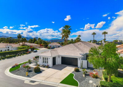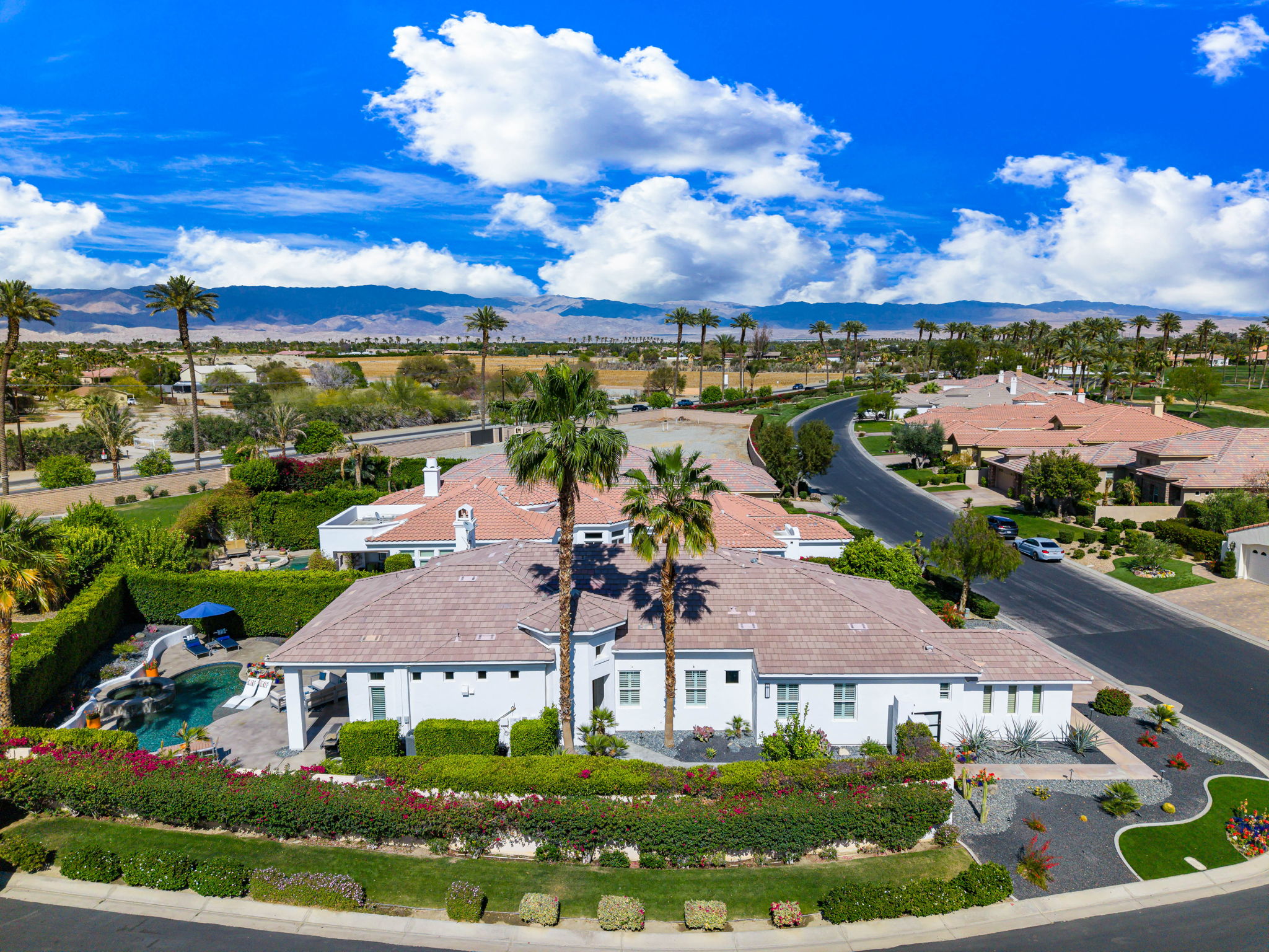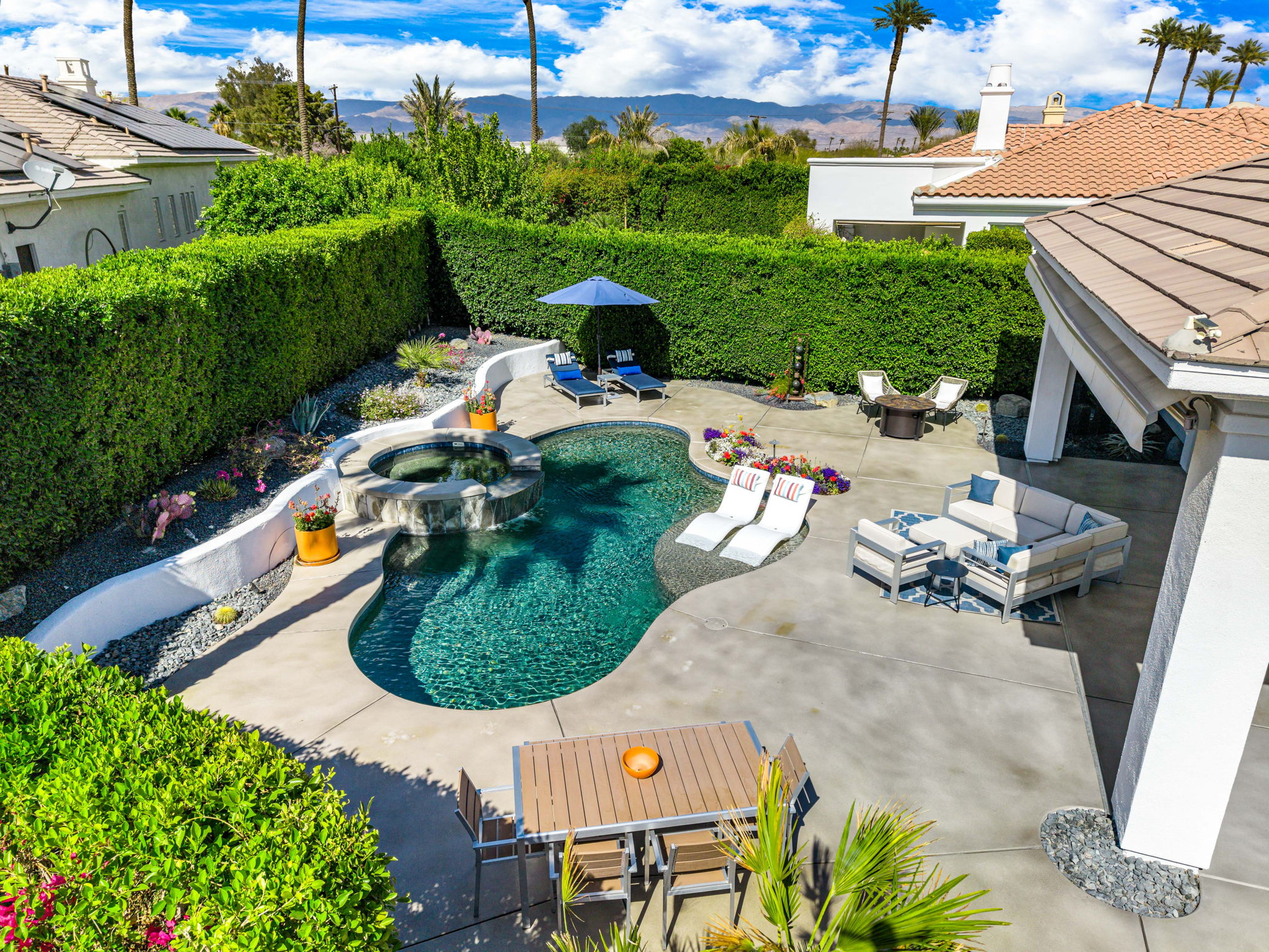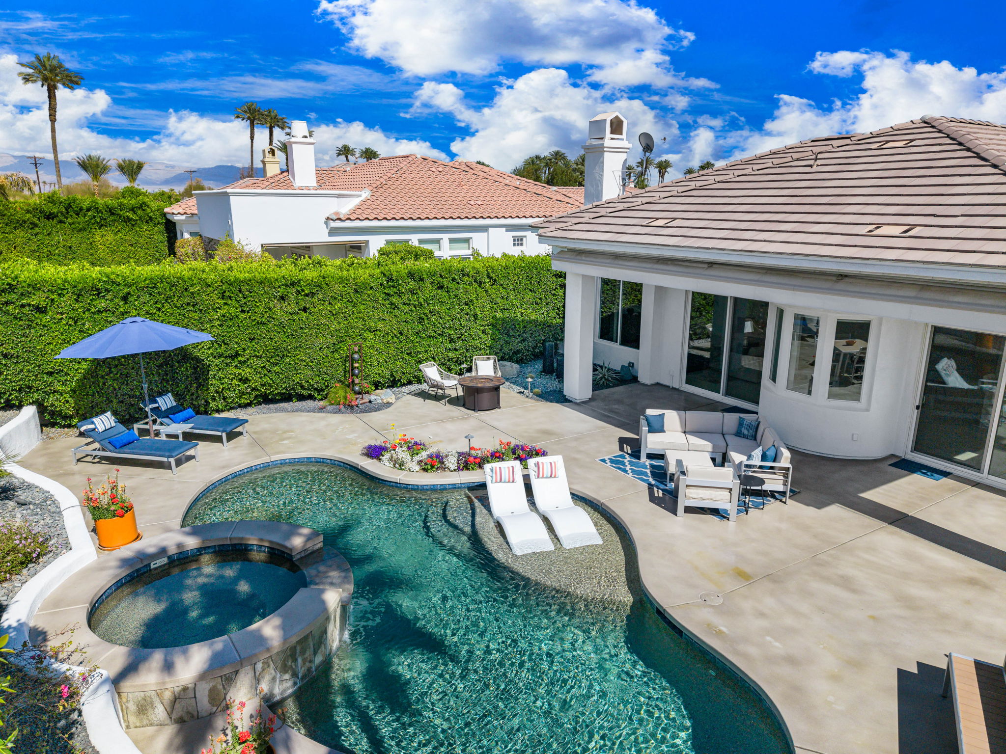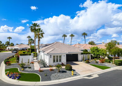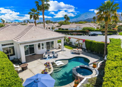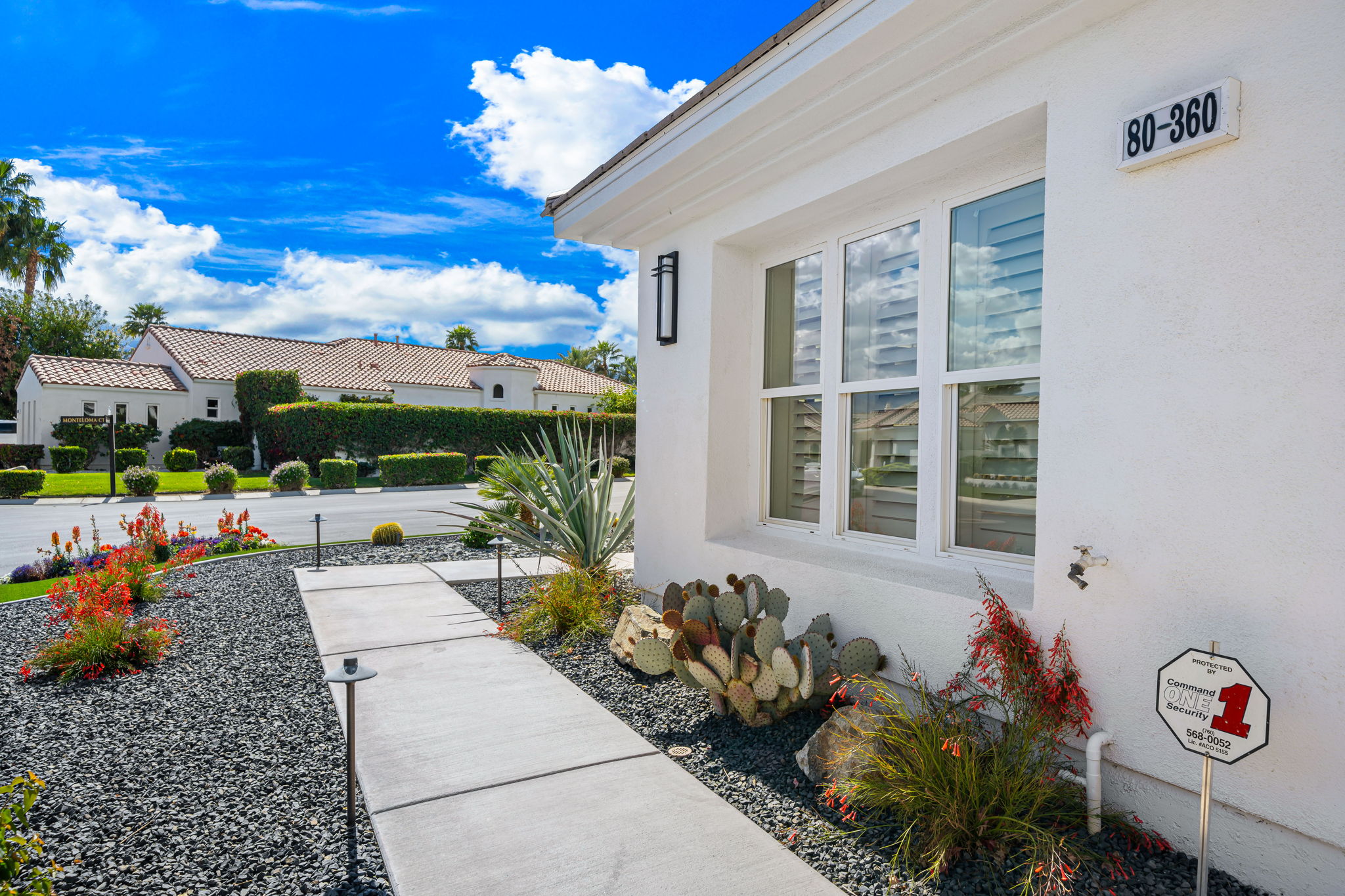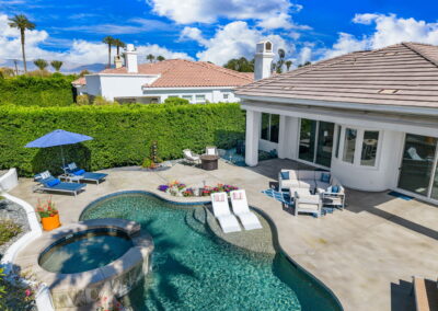 PRICE REDUCED. Private backyard perfect for our 4 legged friends, this house that delivers on all counts! Welcome to 80360 Via Valerosa, an exceptional desert retreat located in the prestigious Mountain View Country Club in La Quinta. This beautifully fully remodeled home combines timeless elegance with modern sophistication and offers the ultimate in indoor-outdoor desert living. Situated on an oversized 12,197 sq ft lot, this 3-bedroom, 4-bathroom residence features the highly sought-after expanded Camina floor plan of 2,634 sq ft of luxurious living space. Every corner of this home has been meticulously updated with premium finishes and designer touches that make it truly move-in ready. Step through the private gated courtyard into a bright and airy interior that blends contemporary design with comfort. The open-concept great room features soaring ceilings, a modern tile fireplace, and panoramic sliding glass doors that frame stunning views and invite natural light. The remodeled kitchen is a chef’s dream, complete with quartz countertops, custom cabinetry, stainless steel appliances, and a spacious island ideal for entertaining. Each of the three bedrooms is en suite, offering privacy and elegance, with remodeled bathrooms, walk-in showers, and custom tile work. The primary suite is a tranquil sanctuary with direct private patio access, dual vanities, a soaking tub, and a generous walk-in closet. Step outside into your own resort-style backyard oasis featuring a custom pebble-tec pool and spa, multiple covered seating areas and a cozy fire pit, all surrounded by beautifully landscaped grounds. Whether you’re hosting guests or enjoying a quiet evening under the stars, this outdoor space delivers peace, privacy, and beauty. Located within the gates of Mountain View Country Club, residents enjoy access to a wealth of amenities including an 18-hole Arnold Palmer Signature golf course, a state-of-the-art fitness center, tennis and pickleball courts, a luxurious clubhouse, and an active social calendar. HOA dues include 24-hour guarded security. Additional features include a 3-car garage, energy-efficient systems, and optional turnkey furnishings. Don’t miss this rare opportunity to own a fully renovated, move-in ready luxury home in one of La Quinta’s most desirable communities. Contact me today to schedule your private tour, this is the desert lifestyle you’ve been dreaming of!