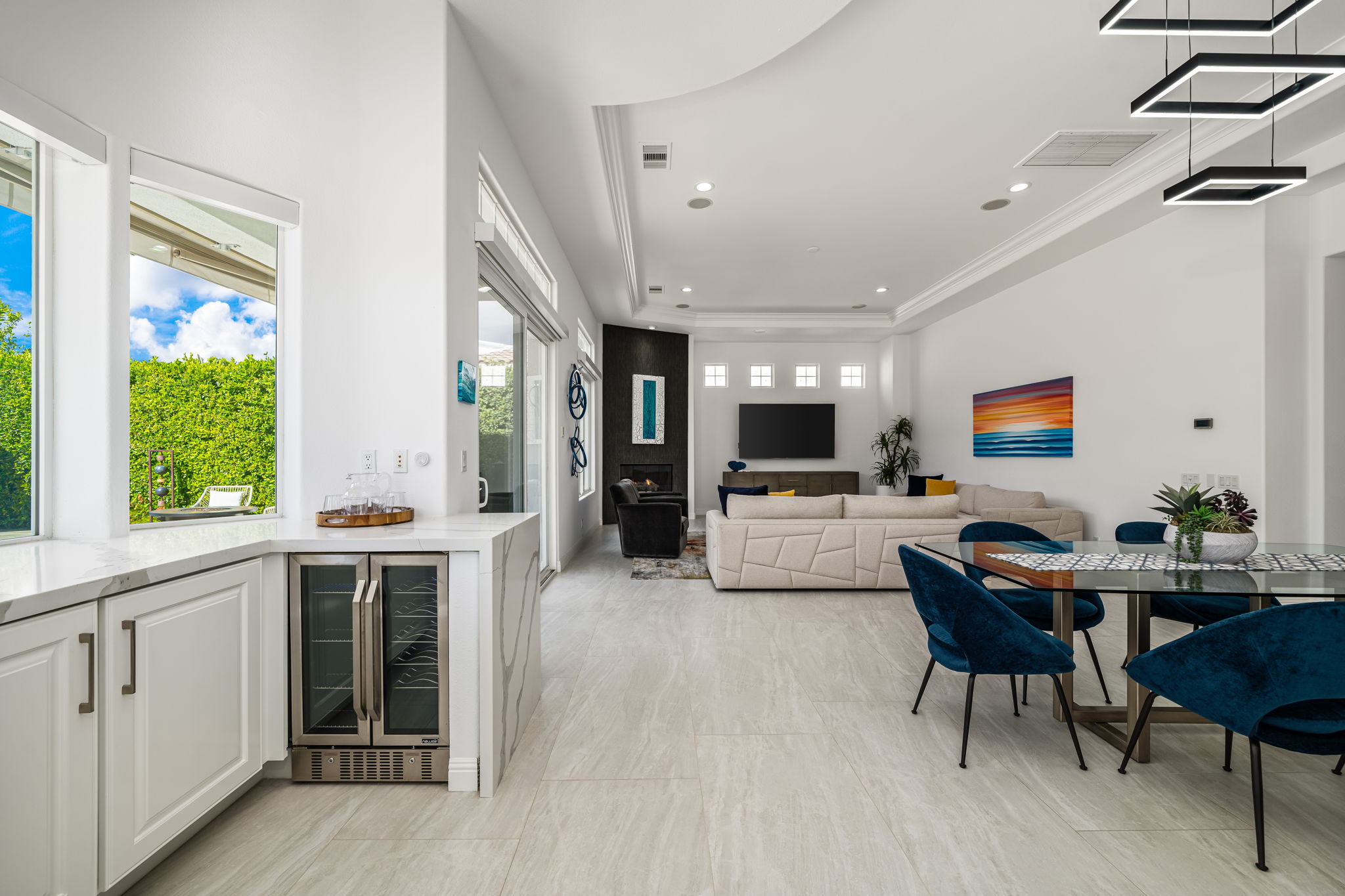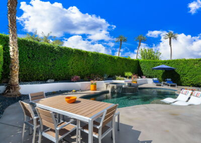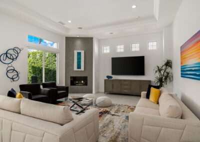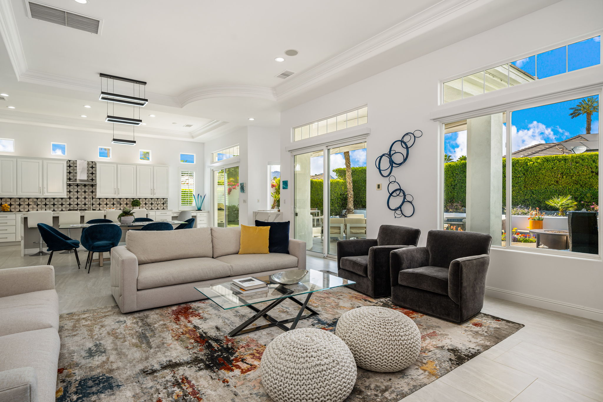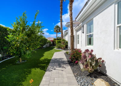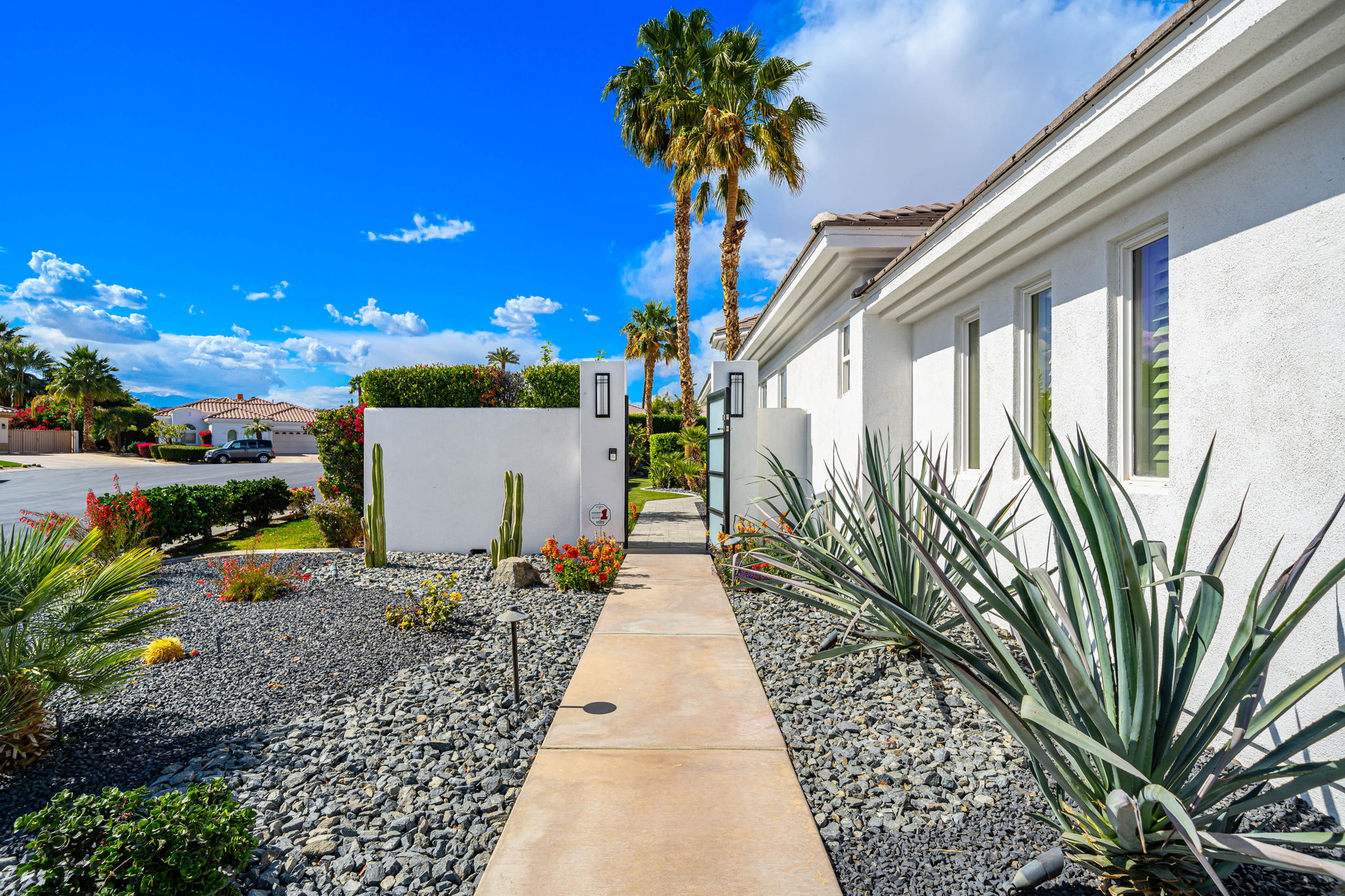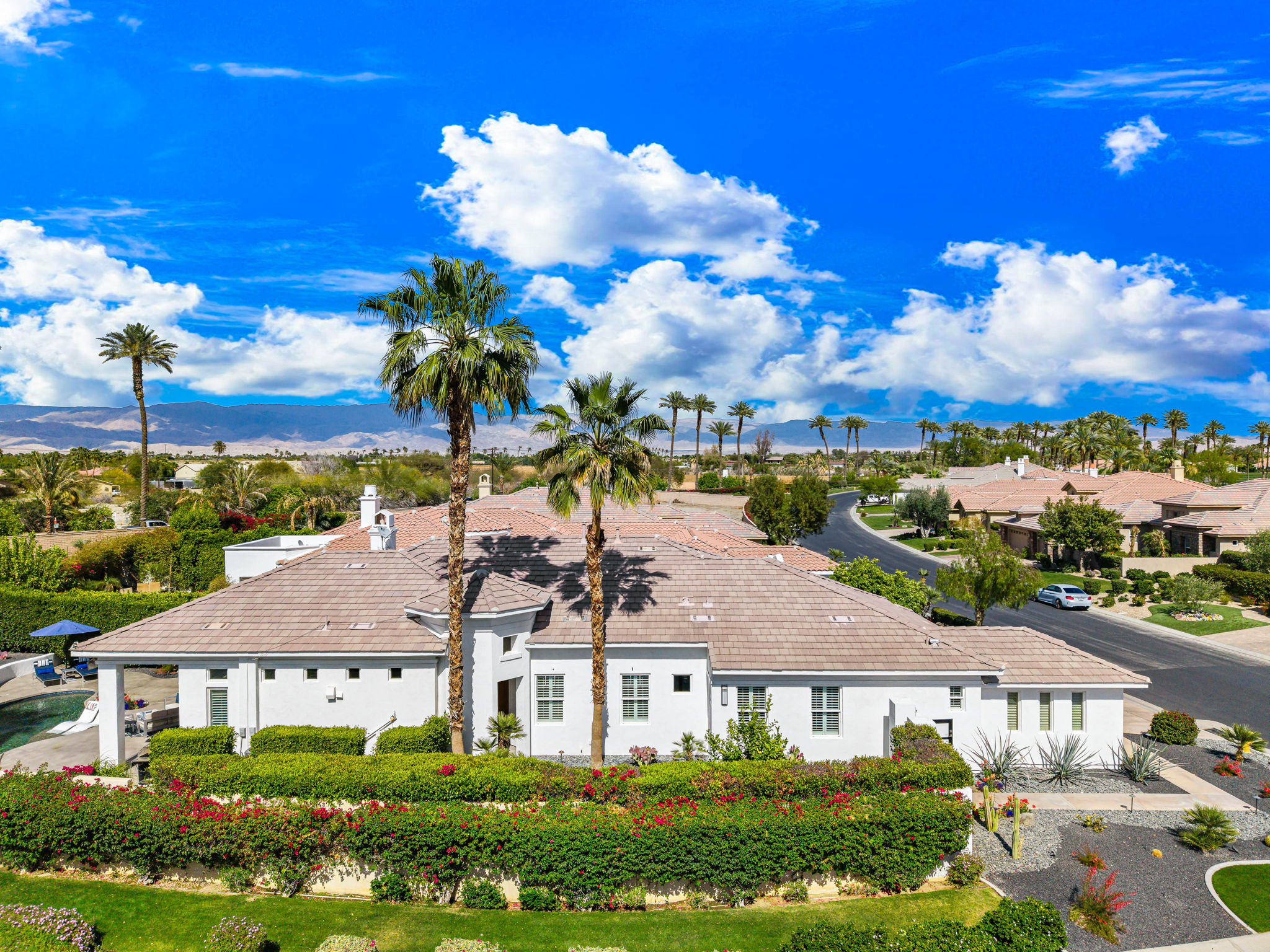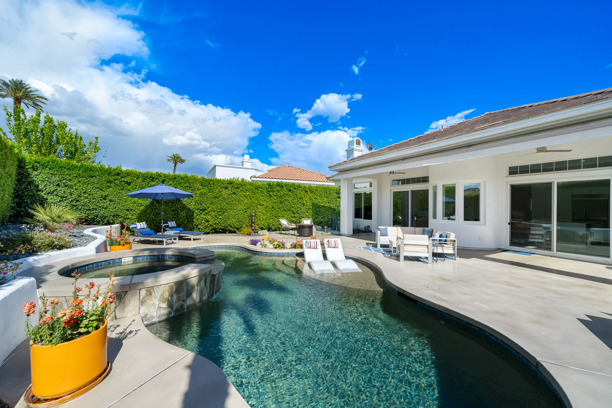 PRICE REDUCED. Private backyard perfect for our 4 legged friends, this house that delivers on all counts! Welcome to 80360 Via Valerosa, an exceptional desert retreat located in the prestigious Mountain View Country Club in La Quinta. This beautifully fully remodeled home combines timeless elegance with modern sophistication and offers the ultimate in indoor-outdoor desert living. Situated on an oversized 12,197 sq ft lot, this 3-bedroom, 4-bathroom residence features the highly sought-after expanded Camina floor plan of 2,634 sq ft of luxurious living space. Every corner of this home has been meticulously updated with premium finishes and designer touches that make it truly move-in ready. Step through the private gated courtyard into a bright and airy interior that blends contemporary design with comfort. The open-concept great room features soaring ceilings, a modern tile fireplace, and panoramic sliding glass doors that frame stunning views and invite natural light. The remodeled kitchen is a chef’s dream, complete with quartz countertops, custom cabinetry, stainless steel appliances, and a spacious island ideal for entertaining. Each of the three bedrooms is en suite, offering privacy and elegance, with remodeled bathrooms, walk-in showers, and custom tile work. The primary suite is a tranquil sanctuary with direct private patio access, dual vanities, a soaking tub, and a generous walk-in closet. Step outside into your own resort-style backyard oasis featuring a custom pebble-tec pool and spa, multiple covered seating areas and a cozy fire pit, all surrounded by beautifully landscaped grounds. Whether you’re hosting guests or enjoying a quiet evening under the stars, this outdoor space delivers peace, privacy, and beauty. Located within the gates of Mountain View Country Club, residents enjoy access to a wealth of amenities including an 18-hole Arnold Palmer Signature golf course, a state-of-the-art fitness center, tennis and pickleball courts, a luxurious clubhouse, and an active social calendar. HOA dues include 24-hour guarded security. Additional features include a 3-car garage, energy-efficient systems, and optional turnkey furnishings. Don’t miss this rare opportunity to own a fully renovated, move-in ready luxury home in one of La Quinta’s most desirable communities. Contact me today to schedule your private tour, this is the desert lifestyle you’ve been dreaming of!