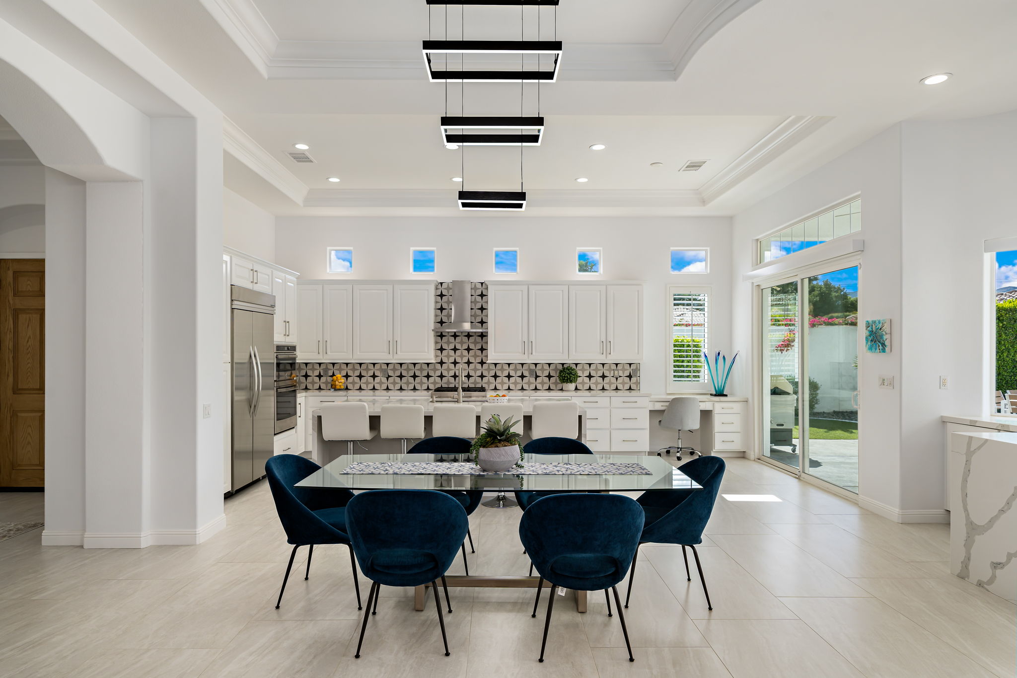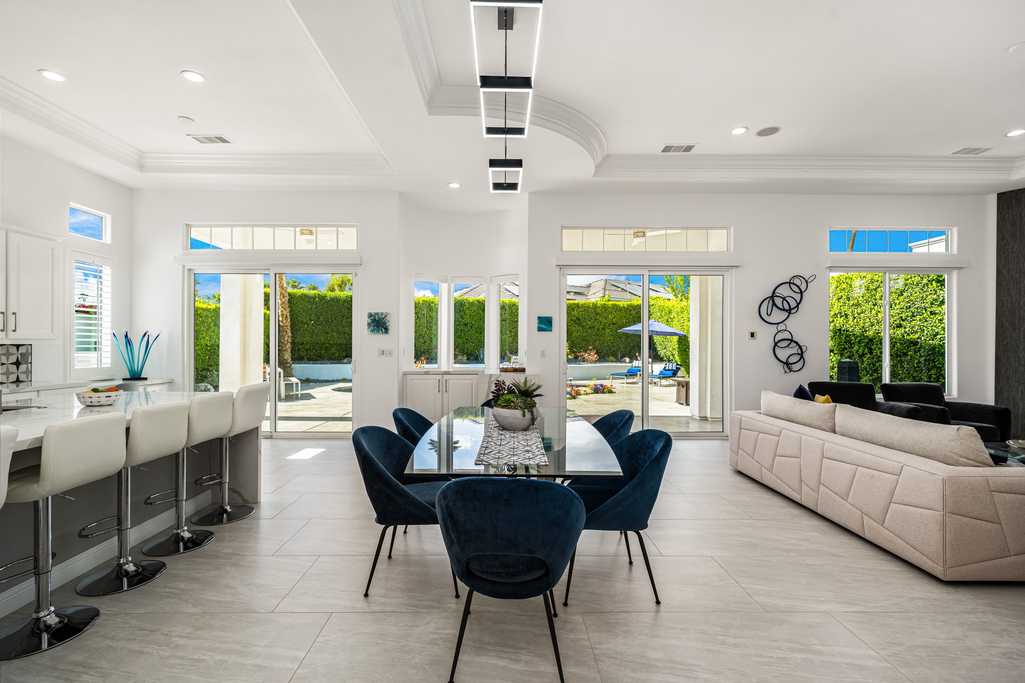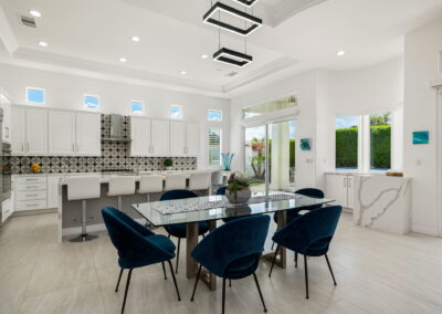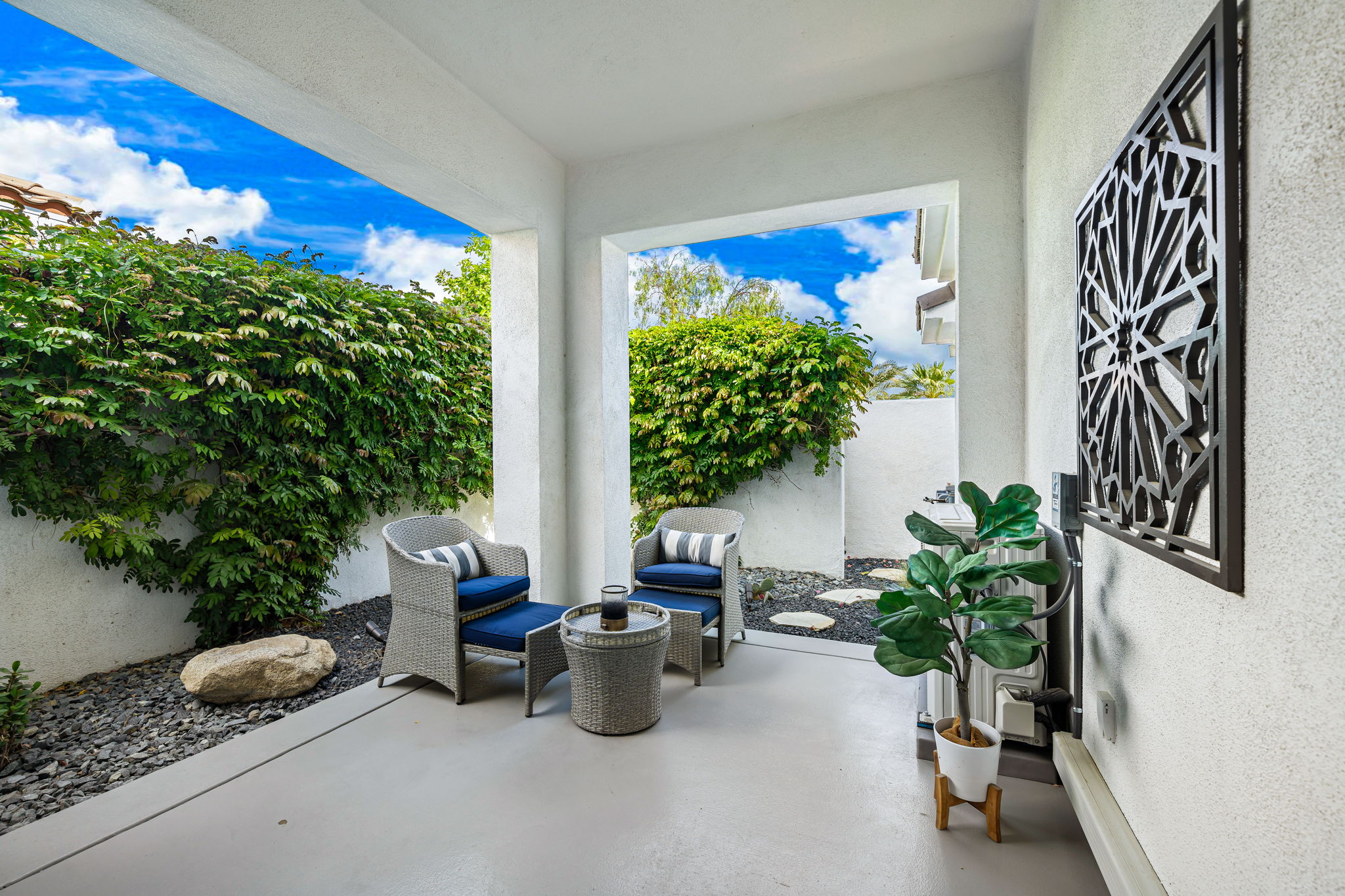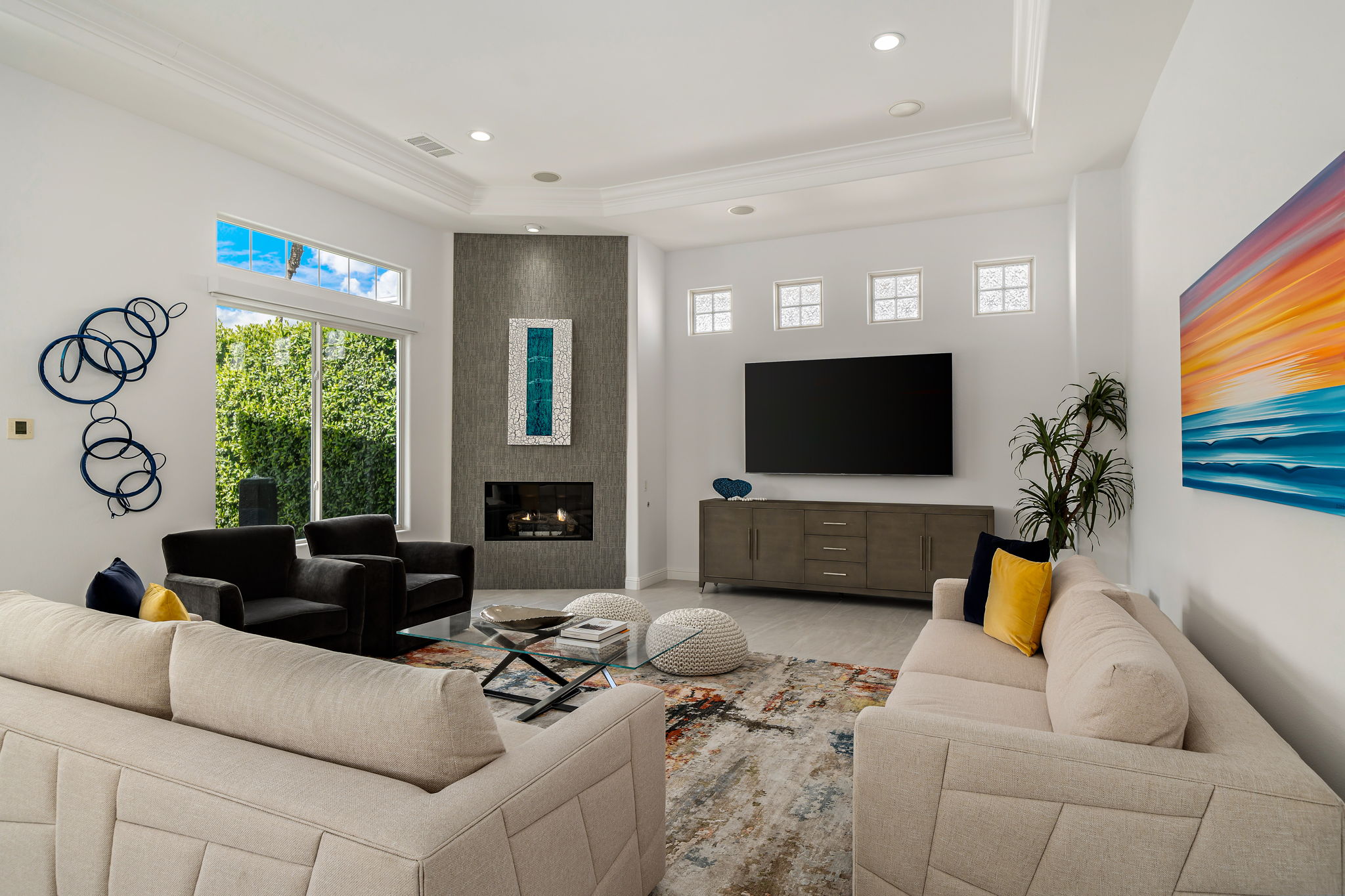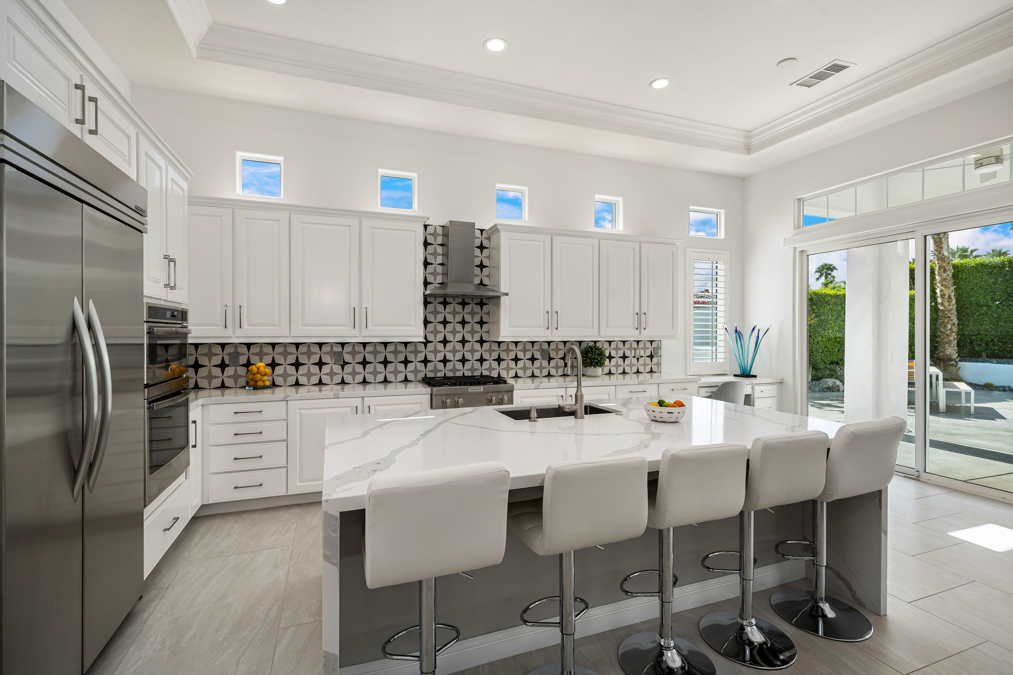 PRICE REDUCED. Private backyard perfect for our 4 legged friends, this house that delivers on all counts! Welcome to 80360 Via Valerosa, an exceptional desert retreat located in the prestigious Mountain View Country Club in La Quinta. This beautifully fully remodeled home combines timeless elegance with modern sophistication and offers the ultimate in indoor-outdoor desert living. Situated on an oversized 12,197 sq ft lot, this 3-bedroom, 4-bathroom residence features the highly sought-after expanded Camina floor plan of 2,634 sq ft of luxurious living space. Every corner of this home has been meticulously updated with premium finishes and designer touches that make it truly move-in ready. Step through the private gated courtyard into a bright and airy interior that blends contemporary design with comfort. The open-concept great room features soaring ceilings, a modern tile fireplace, and panoramic sliding glass doors that frame stunning views and invite natural light. The remodeled kitchen is a chef’s dream, complete with quartz countertops, custom cabinetry, stainless steel appliances, and a spacious island ideal for entertaining. Each of the three bedrooms is en suite, offering privacy and elegance, with remodeled bathrooms, walk-in showers, and custom tile work. The primary suite is a tranquil sanctuary with direct private patio access, dual vanities, a soaking tub, and a generous walk-in closet. Step outside into your own resort-style backyard oasis featuring a custom pebble-tec pool and spa, multiple covered seating areas and a cozy fire pit, all surrounded by beautifully landscaped grounds. Whether you’re hosting guests or enjoying a quiet evening under the stars, this outdoor space delivers peace, privacy, and beauty. Located within the gates of Mountain View Country Club, residents enjoy access to a wealth of amenities including an 18-hole Arnold Palmer Signature golf course, a state-of-the-art fitness center, tennis and pickleball courts, a luxurious clubhouse, and an active social calendar. HOA dues include 24-hour guarded security. Additional features include a 3-car garage, energy-efficient systems, and optional turnkey furnishings. Don’t miss this rare opportunity to own a fully renovated, move-in ready luxury home in one of La Quinta’s most desirable communities. Contact me today to schedule your private tour, this is the desert lifestyle you’ve been dreaming of!