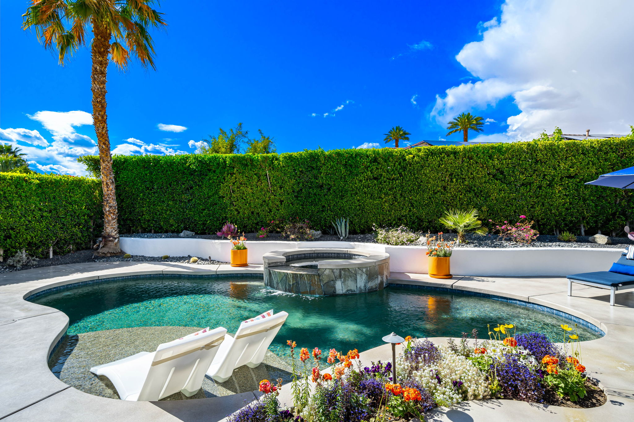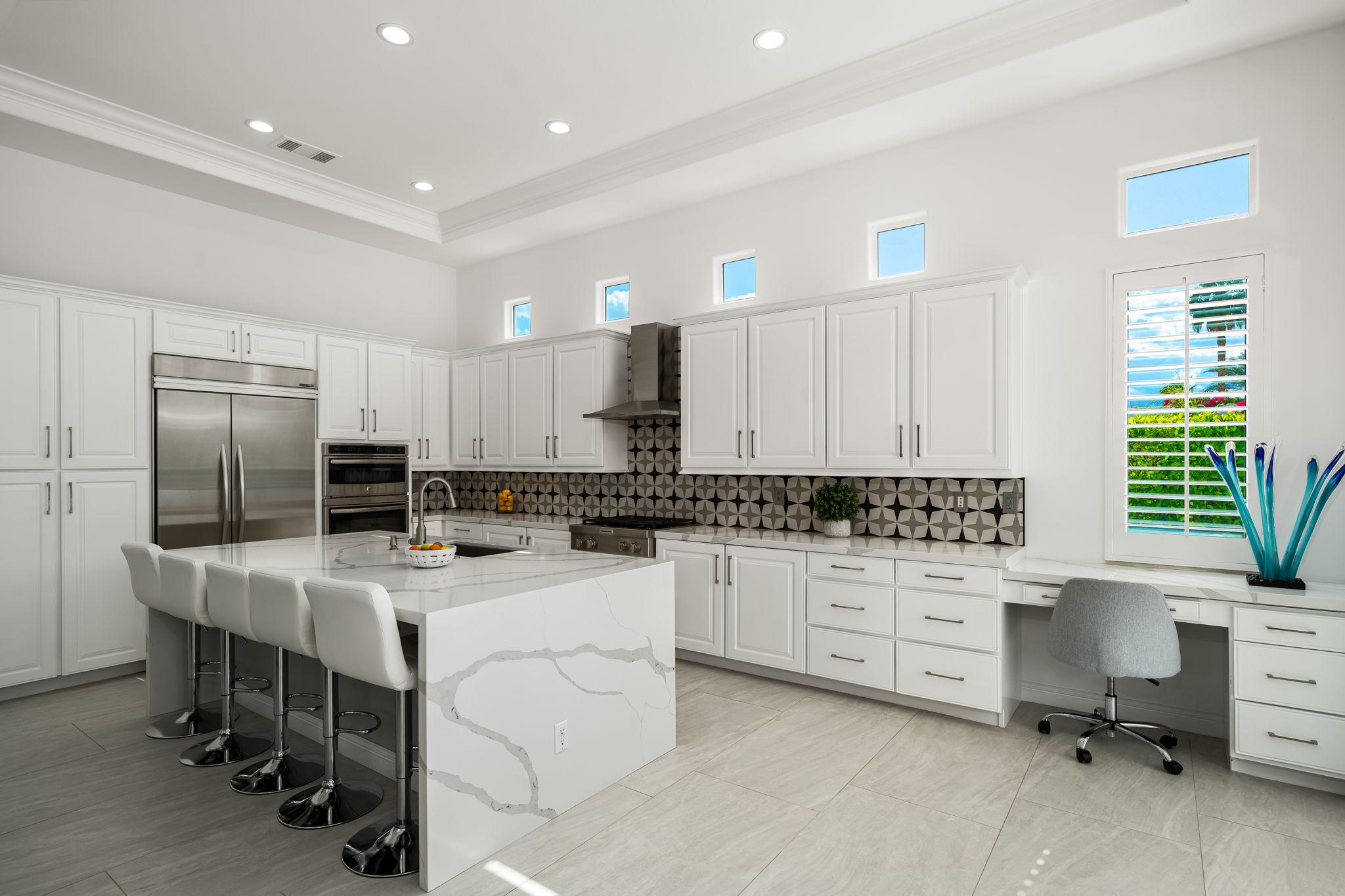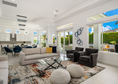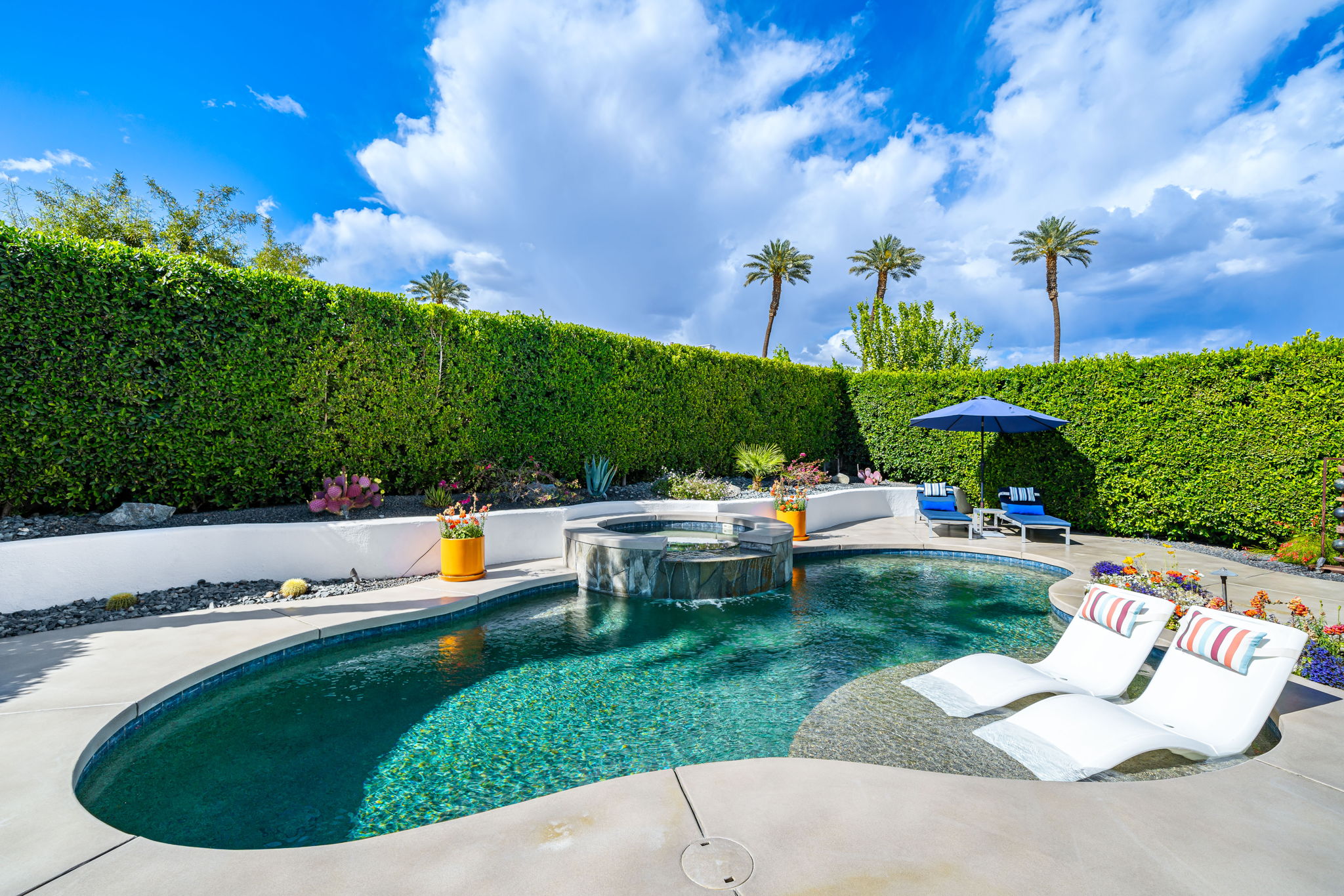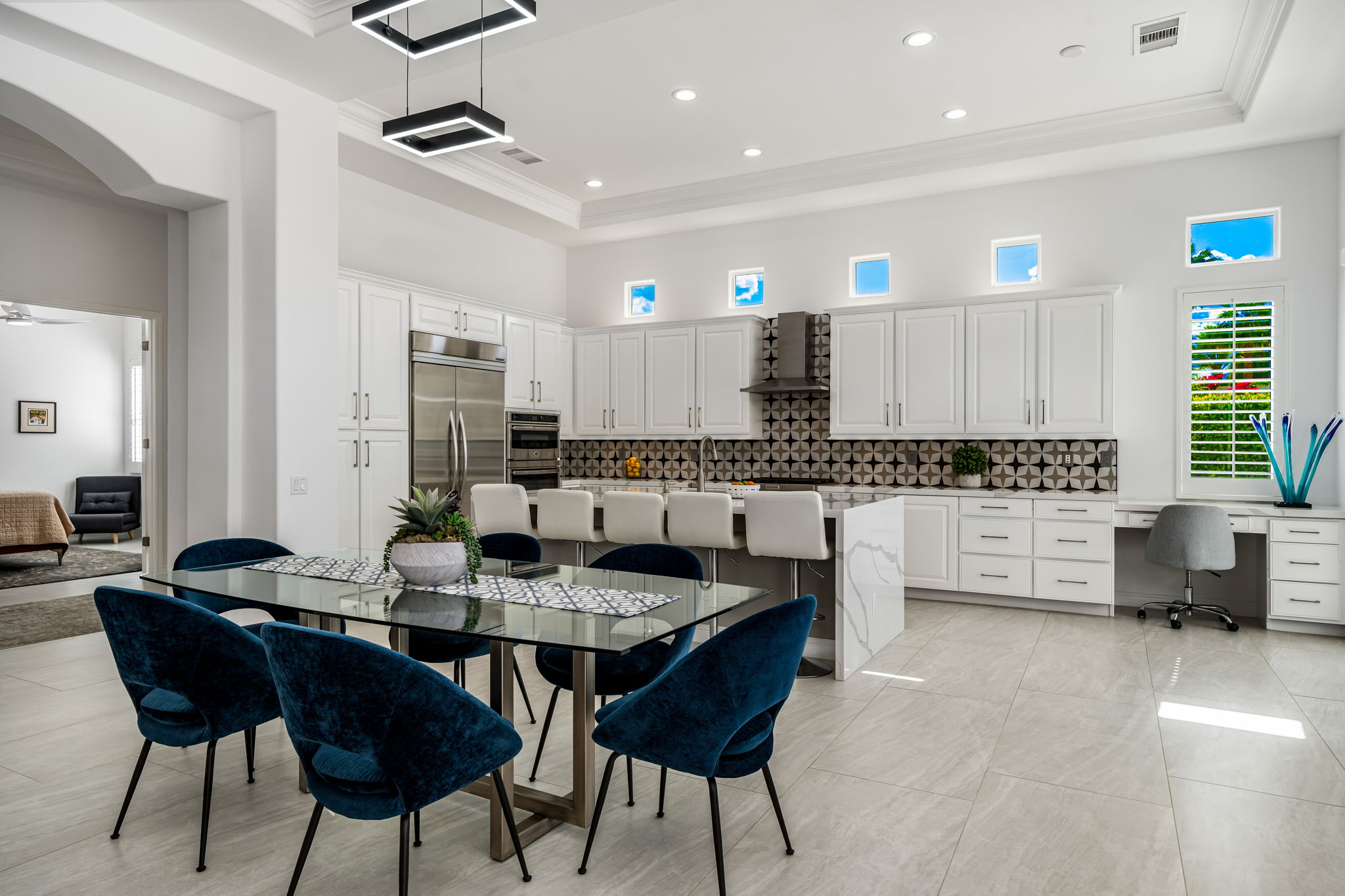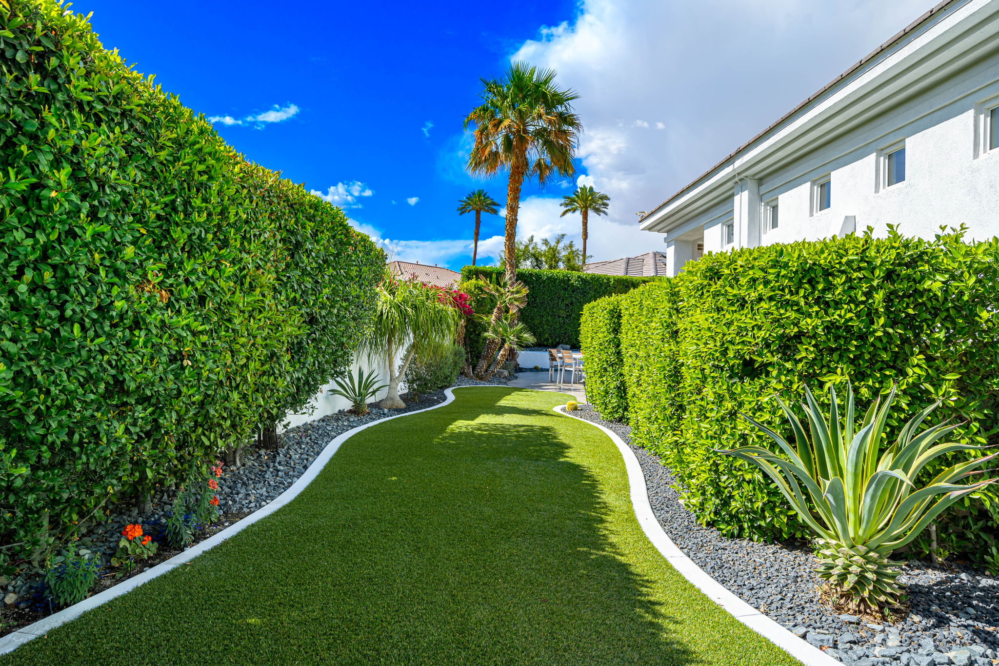 PRICE REDUCED. Private backyard perfect for our 4 legged friends, this house that delivers on all counts! Welcome to 80360 Via Valerosa, an exceptional desert retreat located in the prestigious Mountain View Country Club in La Quinta. This beautifully fully remodeled home combines timeless elegance with modern sophistication and offers the ultimate in indoor-outdoor desert living. Situated on an oversized 12,197 sq ft lot, this 3-bedroom, 4-bathroom residence features the highly sought-after expanded Camina floor plan of 2,634 sq ft of luxurious living space. Every corner of this home has been meticulously updated with premium finishes and designer touches that make it truly move-in ready. Step through the private gated courtyard into a bright and airy interior that blends contemporary design with comfort. The open-concept great room features soaring ceilings, a modern tile fireplace, and panoramic sliding glass doors that frame stunning views and invite natural light. The remodeled kitchen is a chef’s dream, complete with quartz countertops, custom cabinetry, stainless steel appliances, and a spacious island ideal for entertaining. Each of the three bedrooms is en suite, offering privacy and elegance, with remodeled bathrooms, walk-in showers, and custom tile work. The primary suite is a tranquil sanctuary with direct private patio access, dual vanities, a soaking tub, and a generous walk-in closet. Step outside into your own resort-style backyard oasis featuring a custom pebble-tec pool and spa, multiple covered seating areas and a cozy fire pit, all surrounded by beautifully landscaped grounds. Whether you’re hosting guests or enjoying a quiet evening under the stars, this outdoor space delivers peace, privacy, and beauty. Located within the gates of Mountain View Country Club, residents enjoy access to a wealth of amenities including an 18-hole Arnold Palmer Signature golf course, a state-of-the-art fitness center, tennis and pickleball courts, a luxurious clubhouse, and an active social calendar. HOA dues include 24-hour guarded security. Additional features include a 3-car garage, energy-efficient systems, and optional turnkey furnishings. Don’t miss this rare opportunity to own a fully renovated, move-in ready luxury home in one of La Quinta’s most desirable communities. Contact me today to schedule your private tour, this is the desert lifestyle you’ve been dreaming of!